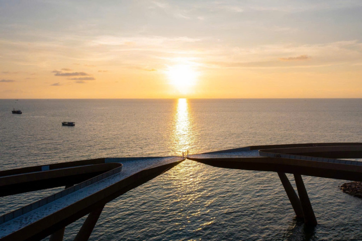Biểu tượng nổi tiếng nhất của thị trấn Hoàng Hôn chính là Cầu Hôn – công trình kiến trúc độc đáo được thiết kế lấy cảm hứng từ câu chuyện tình yêu. Hai nhánh cầu vươn ra biển, chỉ cách nhau 30 cm, tạo nên khoảnh khắc “hôn nhau trong hoàng hôn” đầy lãng mạn. Đây chắc chắn là điểm check-in không thể bỏ qua cho các cặp đôi.